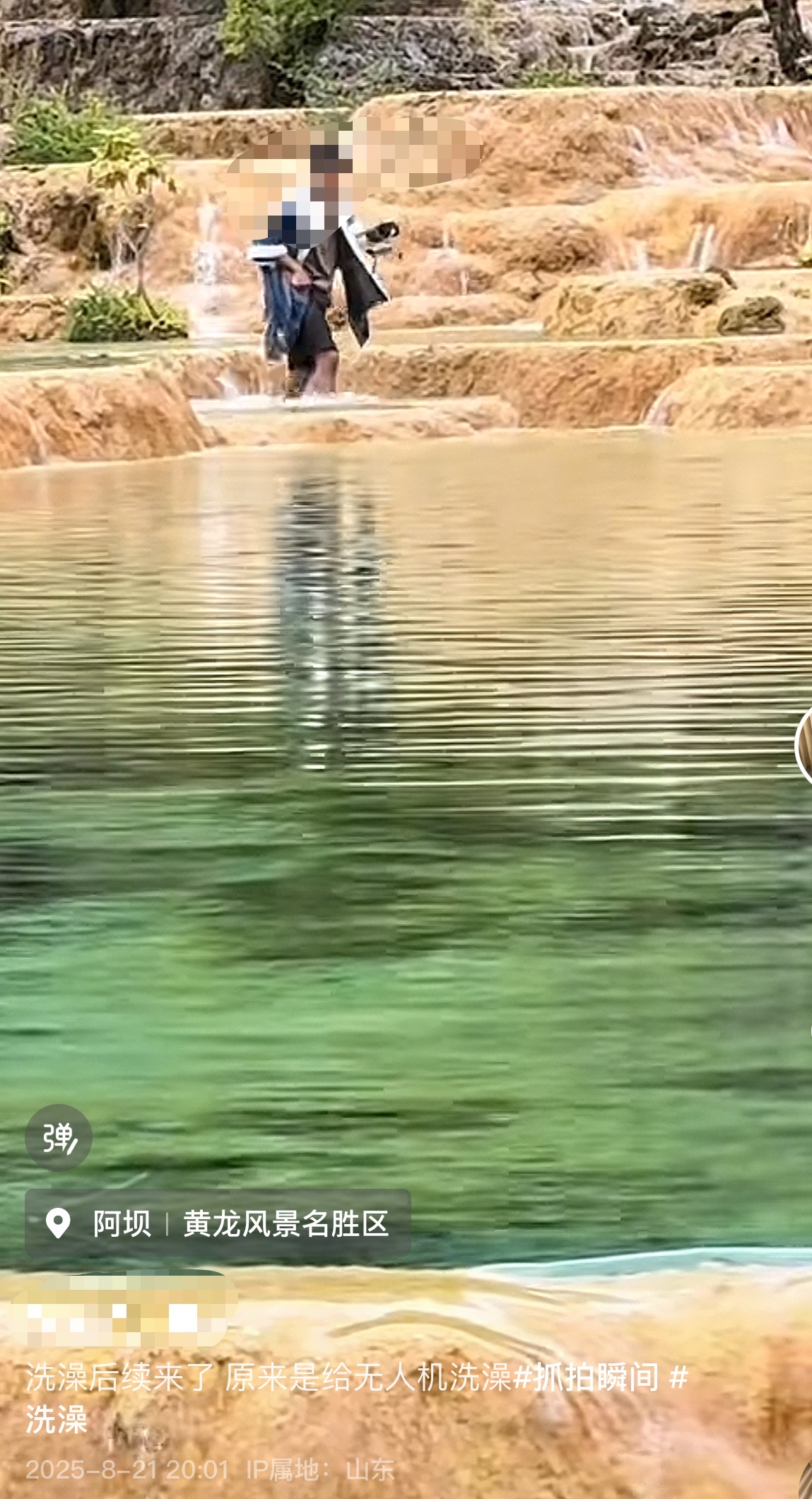8月14日,一名网友发布视频,一男子在钙化池中行走。视频配文称“进来洗澡来了吗?”8月21日,该网友更新视频,配文“洗澡后续来了,原来是给无人机洗澡”。